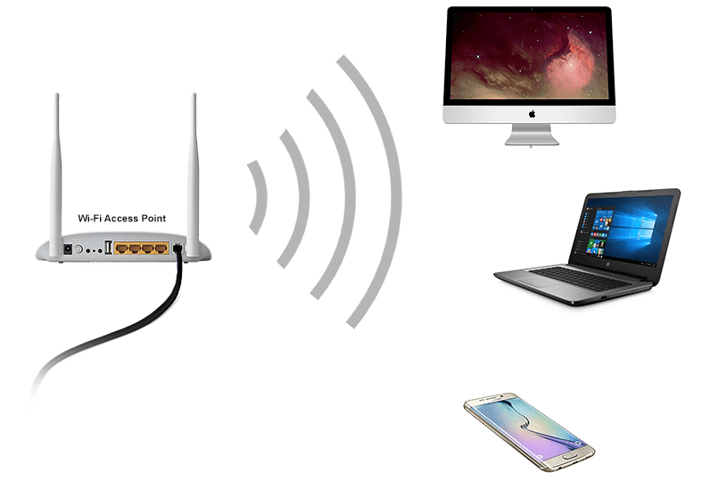 Wi-Fi allows devices such as computers, smartphones, tablets, and IoT devices to connect to a wireless access point (AP), which typically provides connectivity to a wired local network and the internet. Communication occurs using radio waves in unlicensed frequency bands, most commonly 2.4 GHz, 5 GHz, and 6 GHz, with different IEEE 802.11 amendments specifying performance characteristics such as throughput, range, and efficiency.